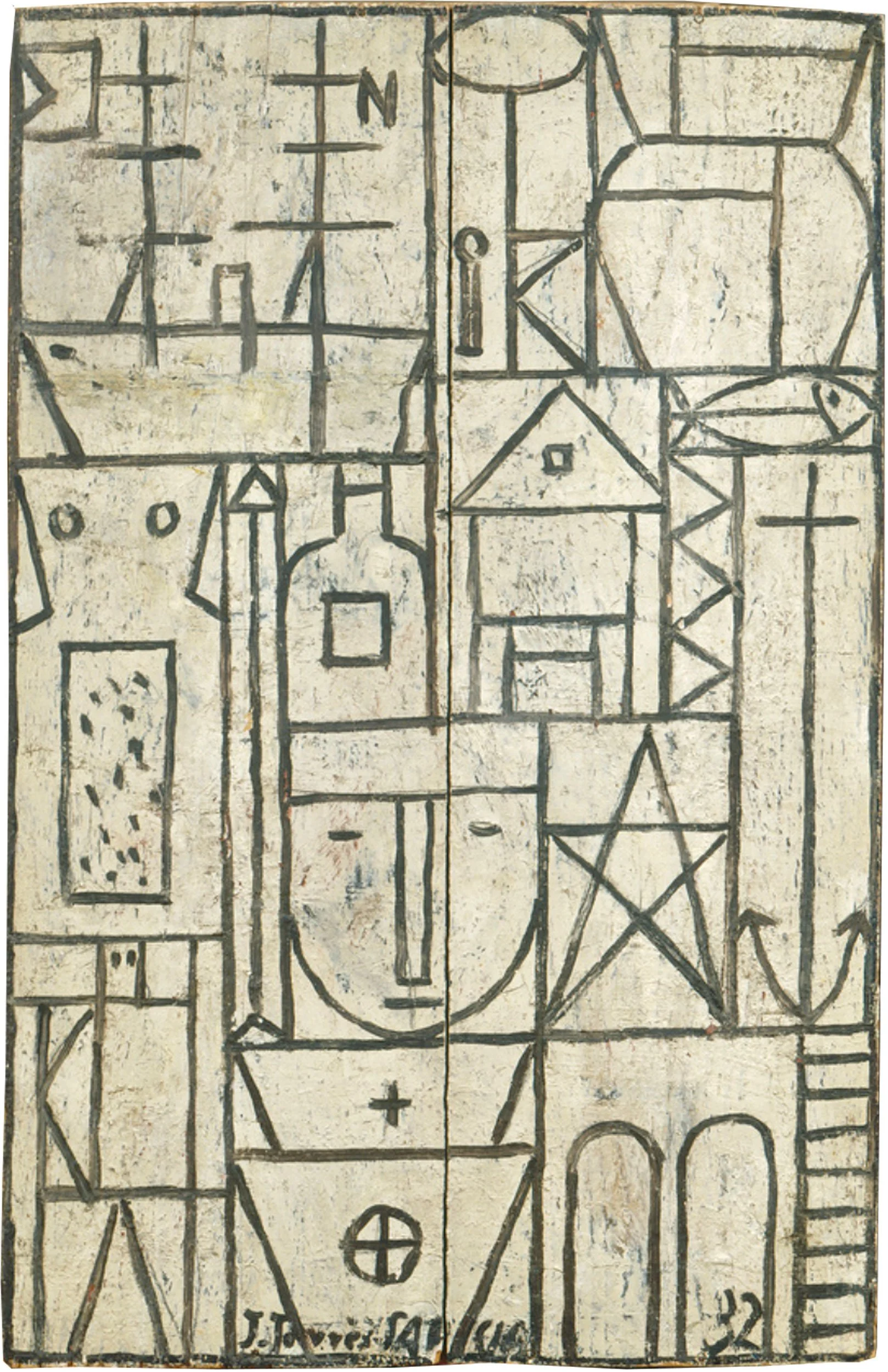 Torres-García emphasizes this condition of an ideal type attributed to represented objects by writing them with uppercase initials. For him, the schematic drawing does not represent a ship (this or that ship), a house (this or that one), but the Ship, (thus, with a capital S), and the House (“as drawn by children”). In this sense, the painted schema is a sign. This pictorial language, built by Torres-García following these schemas, is a deliberately constructed language of signs